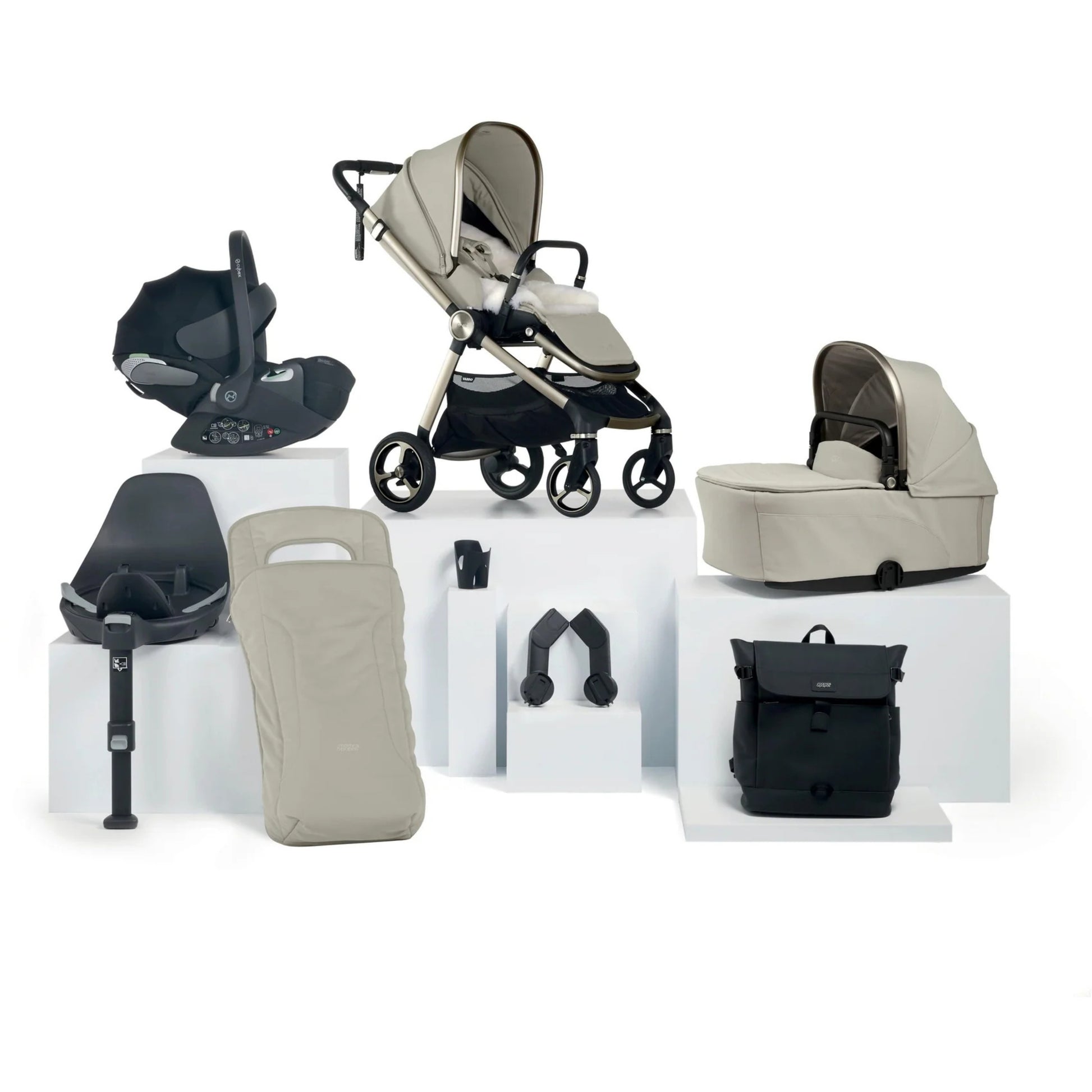 This Bundle includes: Vardo Pushchair, Vardo Carrycot, Cybex Cloud T i-Size Rotating Baby Car Seat, Cybex Base T 360° Rotating ISOFIX Car Seat Base, Vardo Footmuff, Luxury Sheepskin Pushchair Liner, Utilitarian Backpack, Universal Cup Holder & Vardo Car Seat Adaptors for Cybex/Maxi-Cosi